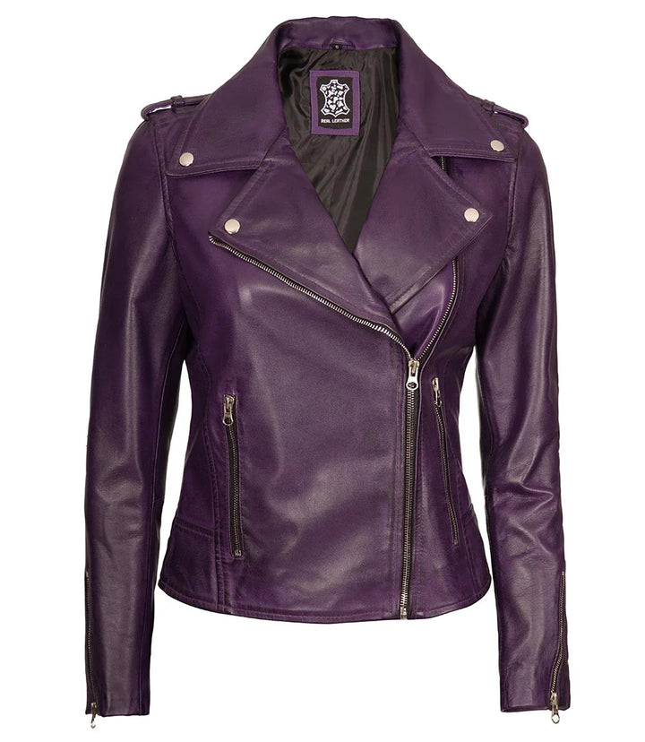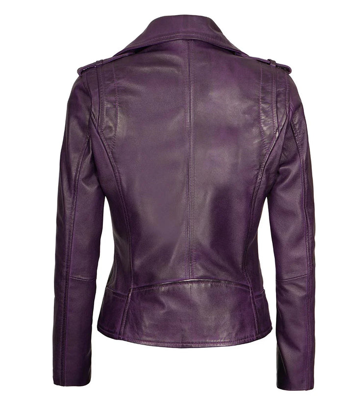 Rehaussez votre garde-robe avec notre veste de moto en cuir violet pour femme. Un mélange de couleurs riches et audacieuses et de design de moto classique, cette veste vous permet de vous démarquer avec style. Fabriquée à partir du meilleur cuir, elle en dit long sur votre sens de la mode, mais promet également durabilité et confort pour chaque trajet ou rendez-vous.