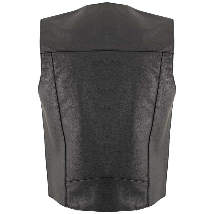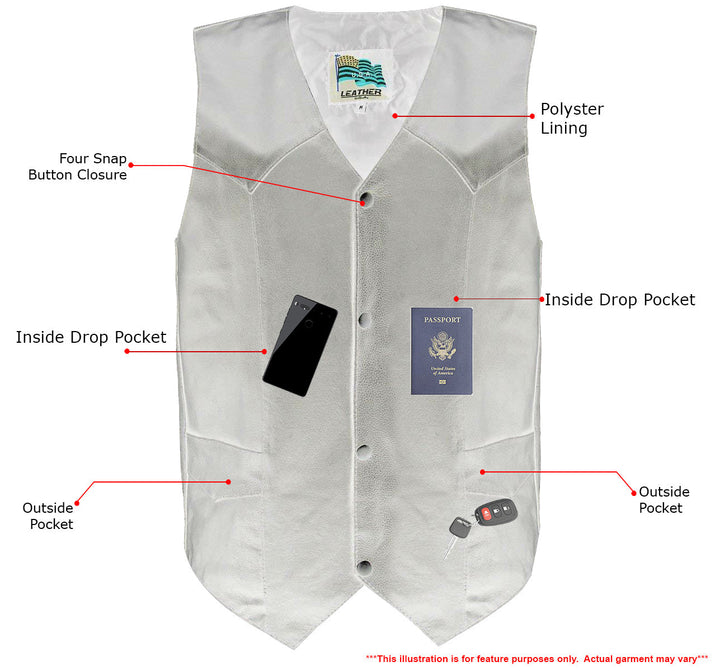The ‘Club’ Vest by USA Leather is Made of Durable Premium Leather. Featuring a Sleek Design with Black 4 Front Snap Button Closure, A Solid Leather Back Panel (Perfect for Club Patches Or Embroidery Ready), Two Outside Front Hand Pockets, Inside Left and Right Drop Pockets and Fully Lined with Polyester Material. This Exclusive Vest Is Only Found Here, At Leatherup, The Web's Most Popular Leather Store.