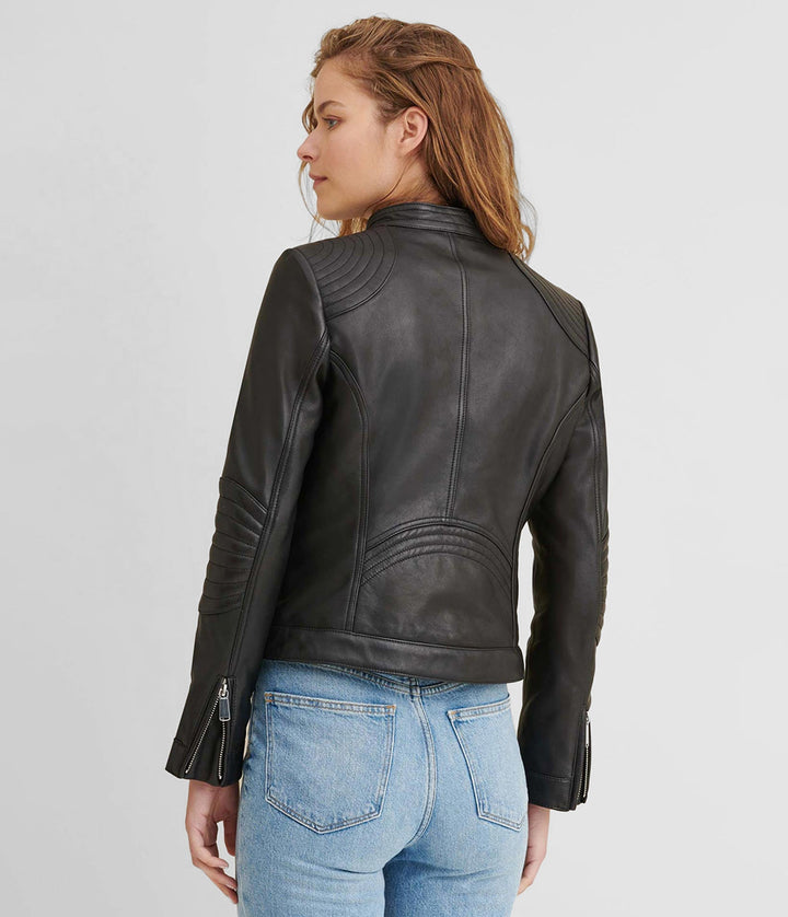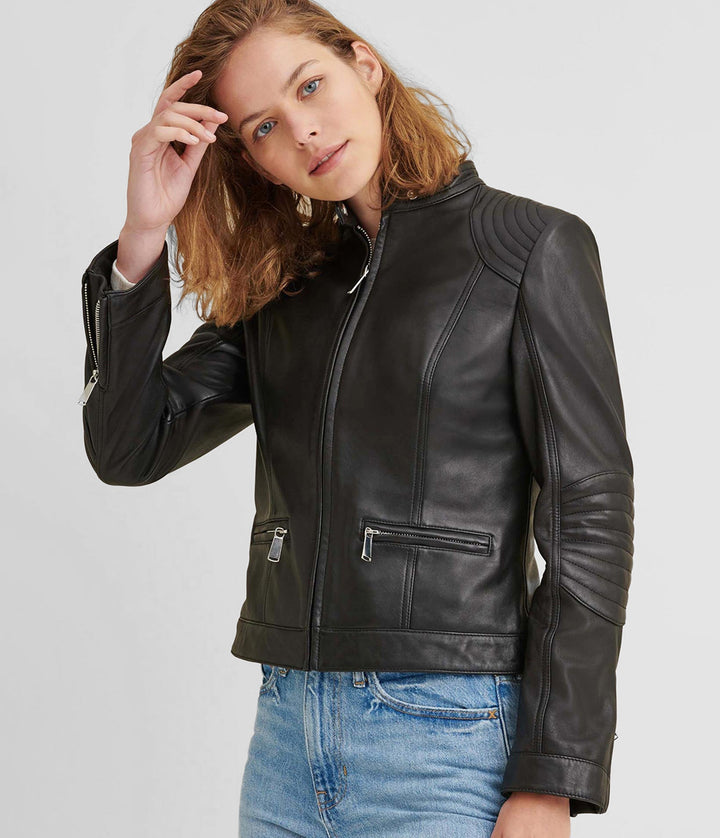 - Closure: Full-zip placket; mandarin collar with snap closure