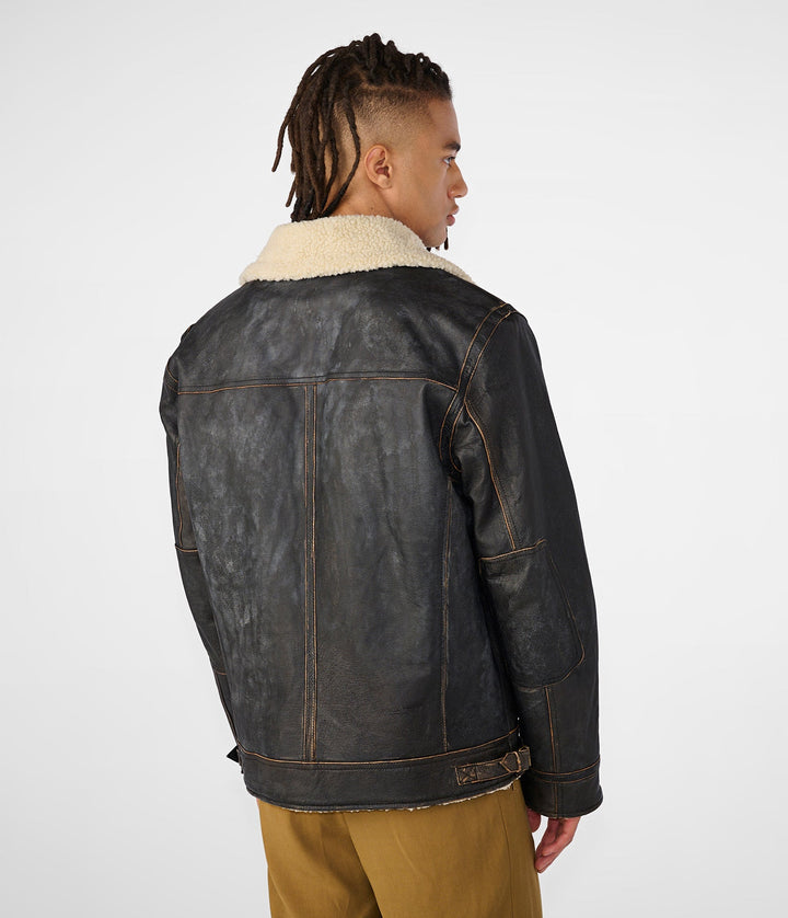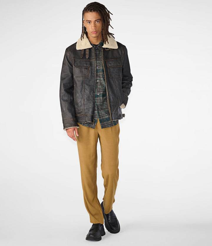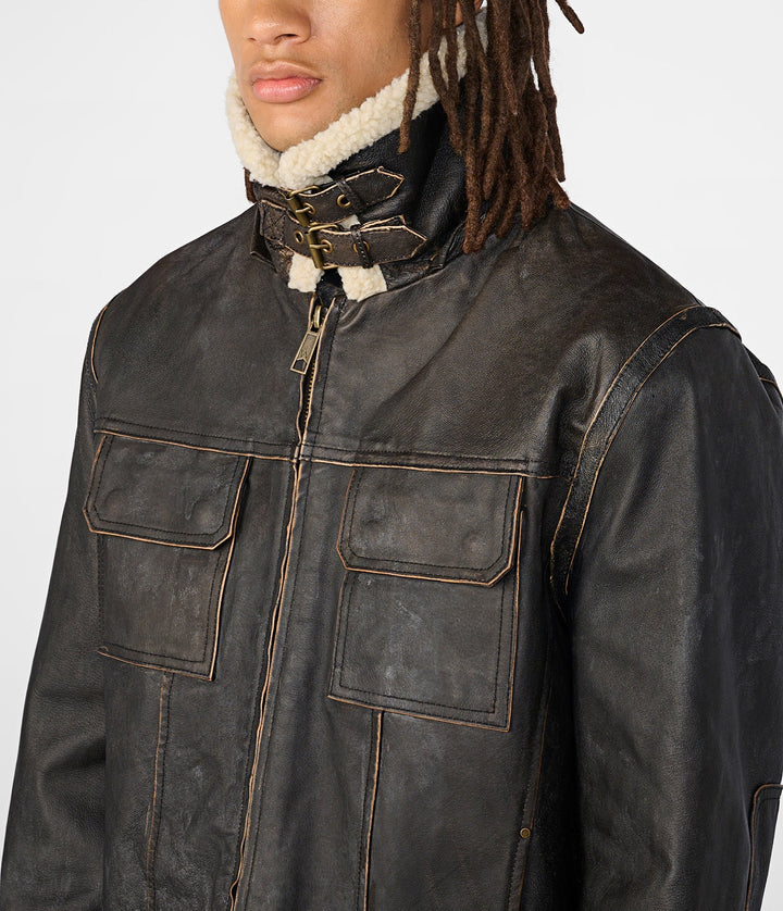 The removable faux shearling-lined hood offers flexibility between urban edge and classic appeal, while snap chest pockets and buckled side tabs underscore functional detail. Stitched shoulder accents and a zippered front with a collar buckle add refined character to this standout layer.