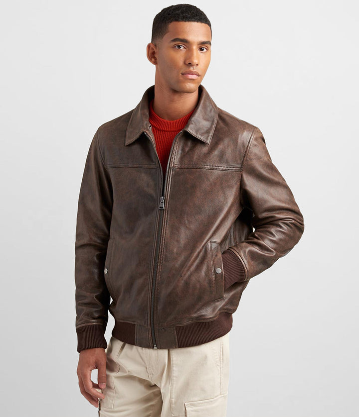 Command attention with the Leather Aviator Bomber With Detachable Faux Fur by 7corse – a standout addition to our men’s leather jackets collection. Inspired by classic flight gear, this jacket combines military ruggedness with luxury comfort.