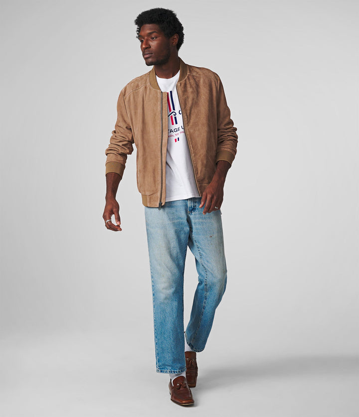 The Stratton Bomber is made from 100% genuine suede leather, offering a softer, matte finish ideal for premium men’s leather jackets.