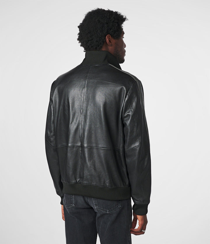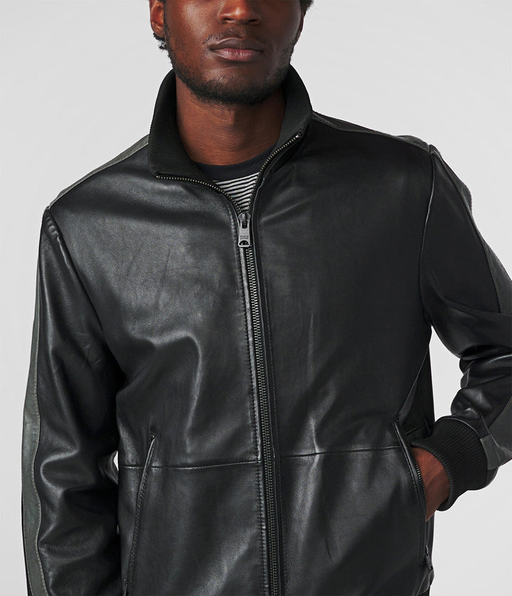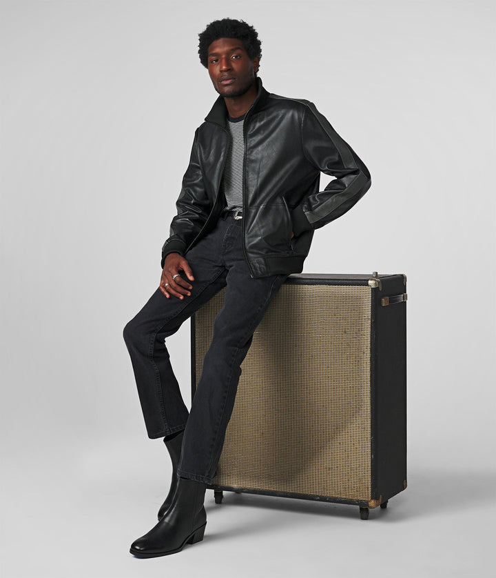 The Thomas Bomber Leather Jacket from 7corse captures the essence of vintage cool with a modern twist. Featuring bold stripe detailing down the sleeves and a structured bomber fit, this jacket brings an athletic edge to your leather wardrobe.