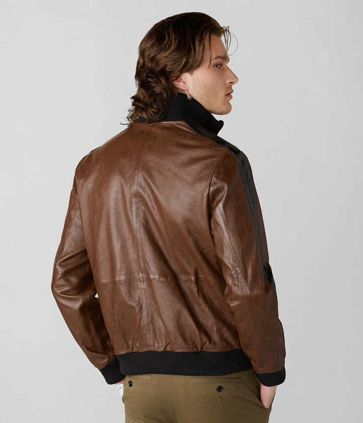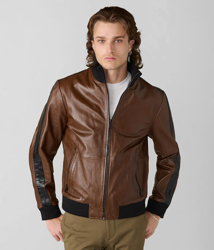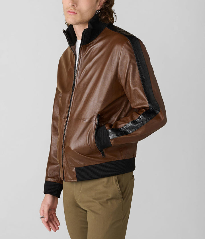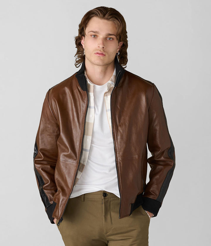 The Thomas Bomber Leather Jacket brings a retro-sport edge to the classic bomber style. Crafted from genuine leather with contrast sleeve striping and rib-knit trim, it’s a standout in the world of men’s leather jackets. Whether you're layering for a casual city outing or stepping into weekend plans, this 7corse piece offers comfort, style, and premium quality in one.