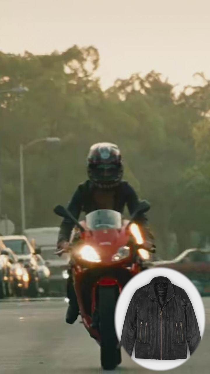Whether you’re heading out for a night ride or aiming for an effortlessly edgy daytime look, this black leather jacket brings Hollywood-inspired style to your wardrobe.
