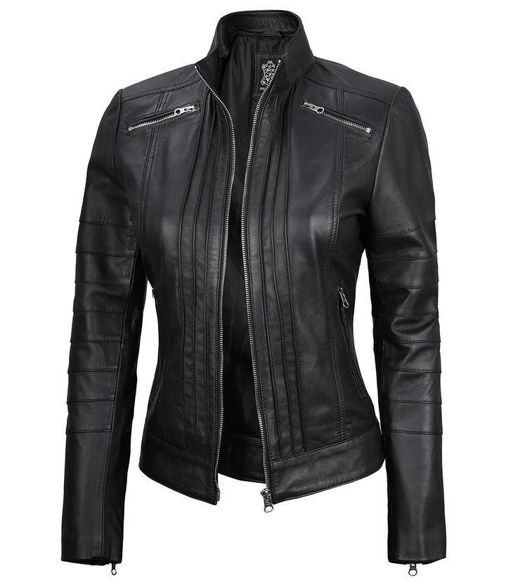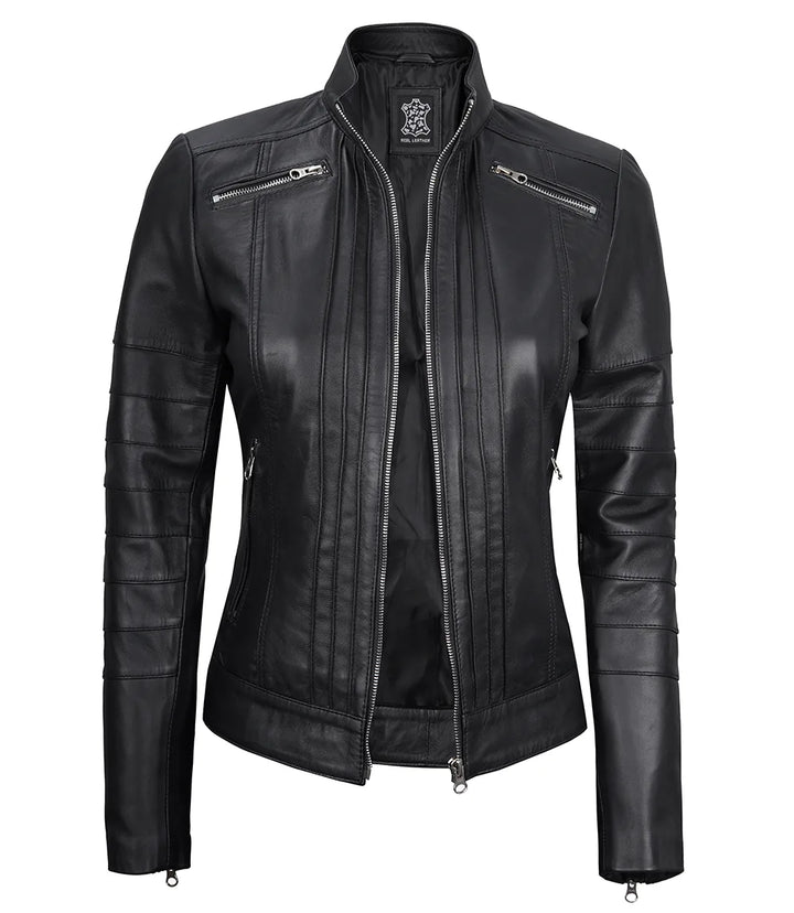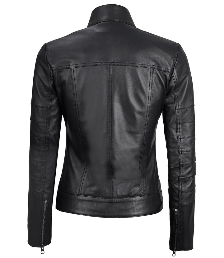 Key Features: Women’s Black Real Leather Café Racer Jacket with Decorated Seams